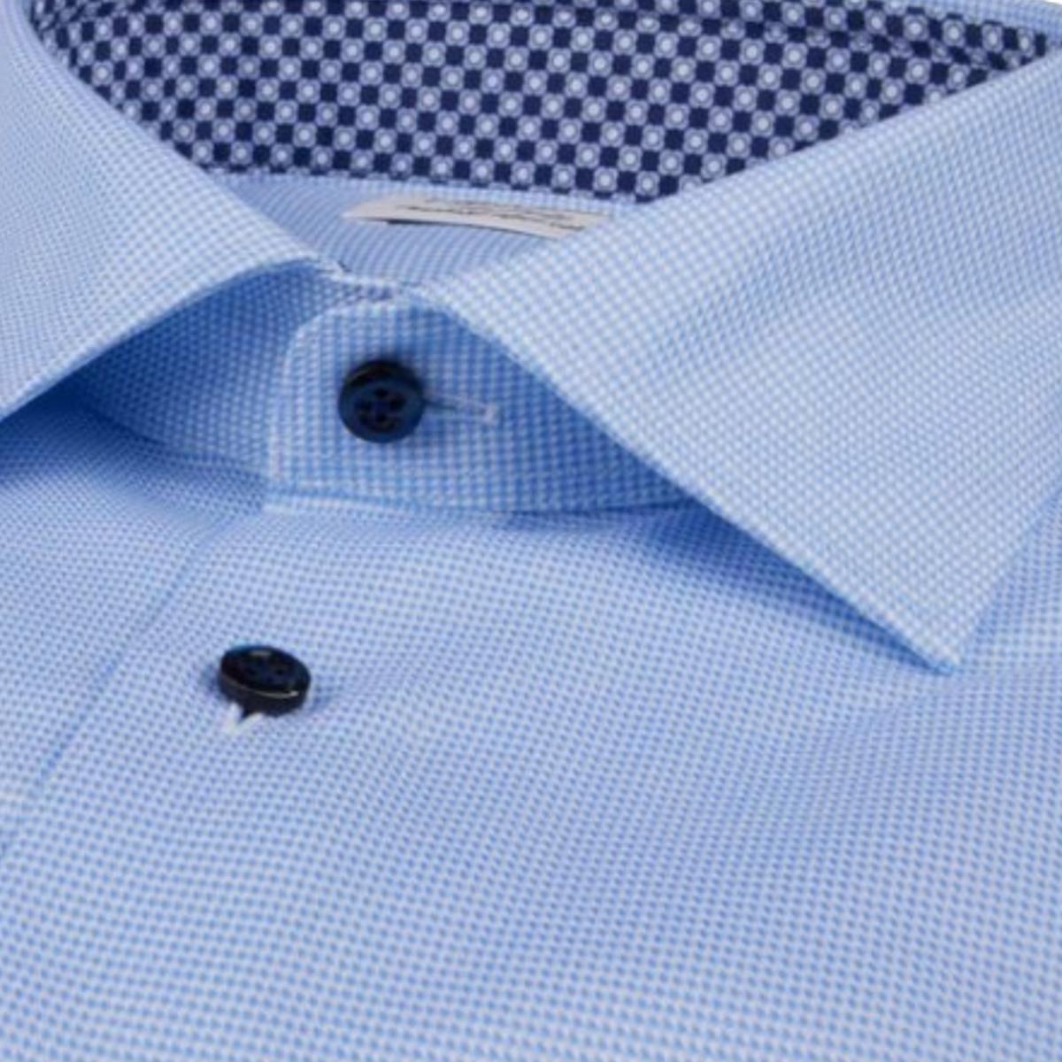 Two fold, supper cotton tic weave. Made in Sweden. Contrast pattern under cuff and behind collar band. Contrast navy buttons. Wear with or without a tie to enhance your ensemble.