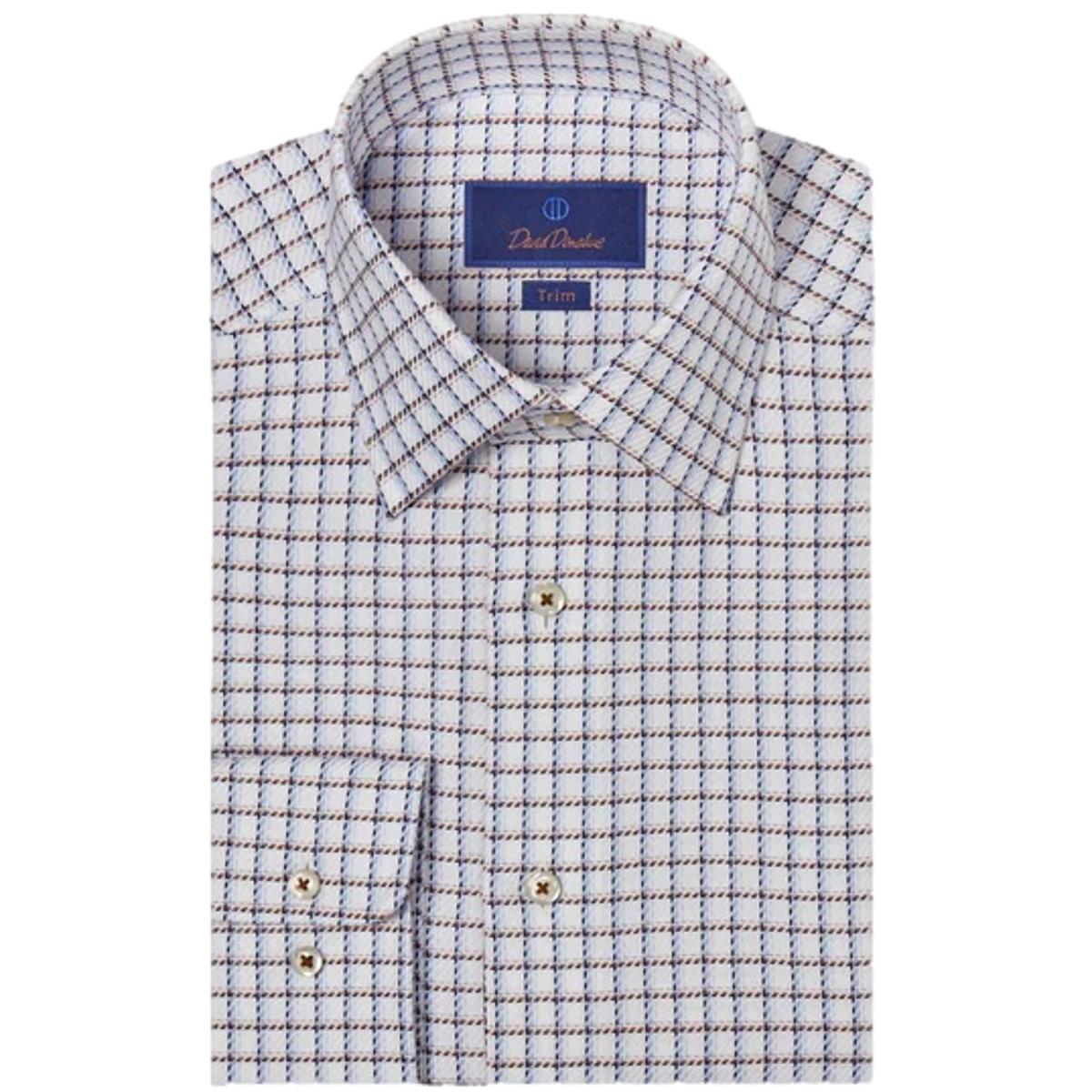 Light blue and chocolate check. Works with coats, vests, sweaters or byitself. Washable