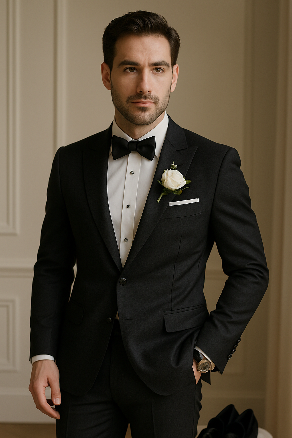 Avoid common mistakes like wearing neckties instead of bow ties, substituting business suits, choosing colored shirts, or selecting inappropriate footwear. A properly fitted tuxedo – whether rented or purchased – should be tailored to your measurements for the best appearance.