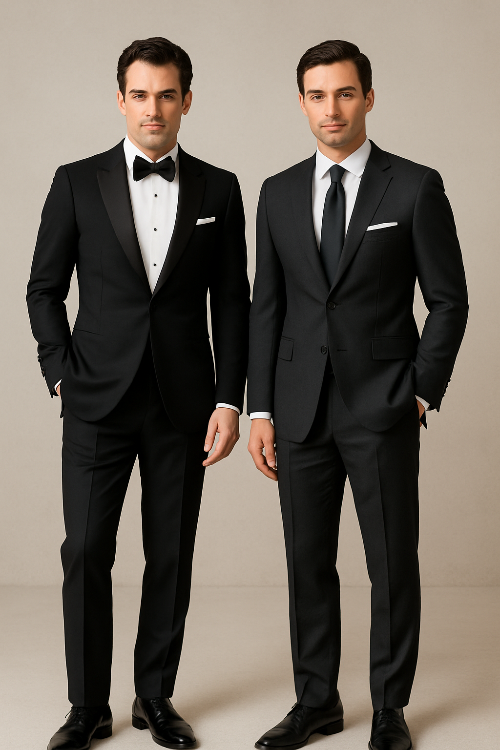 The decision between a tuxedo and suit depends on your wedding’s formality, venue, and personal preferences. Evening formal weddings typically call for tuxedos, while afternoon or casual venues may suit dark suits better.
