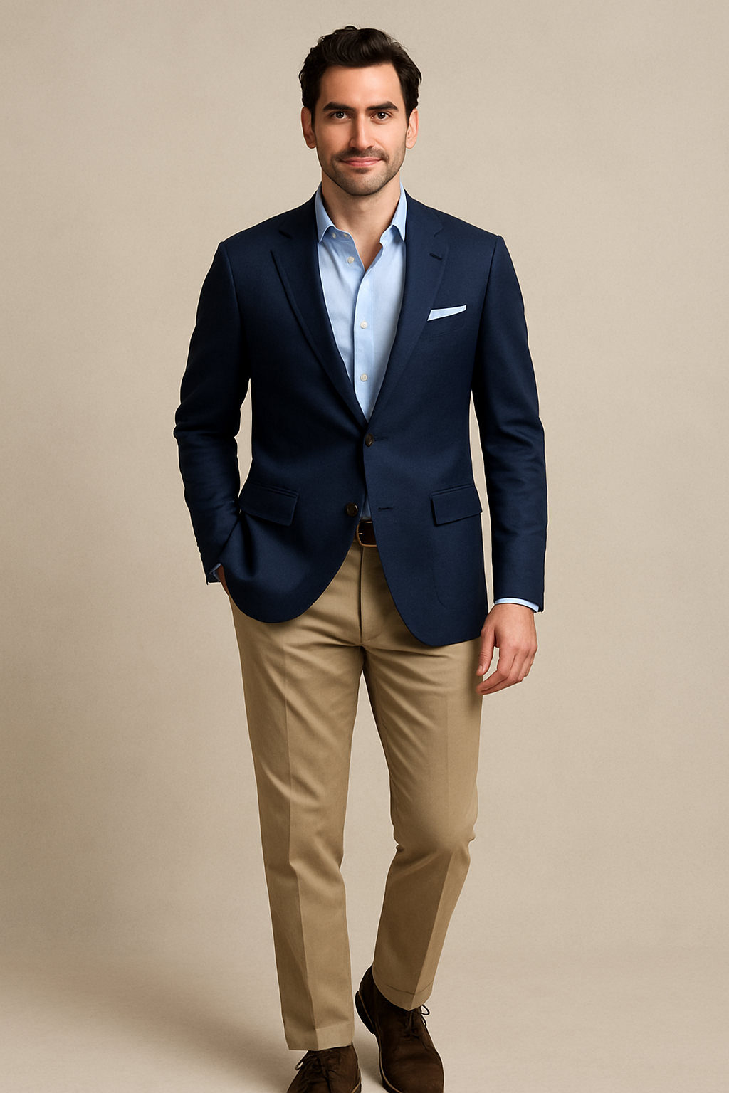 Focus on crisp, coordinated pieces: a blazer or sport coat paired with trousers or chinos, a dress shirt with optional open collar styling, and smart shoes like loafers or derbies. Avoid jeans, sneakers, t-shirts, shorts, and overly casual items that might appear disrespectful.