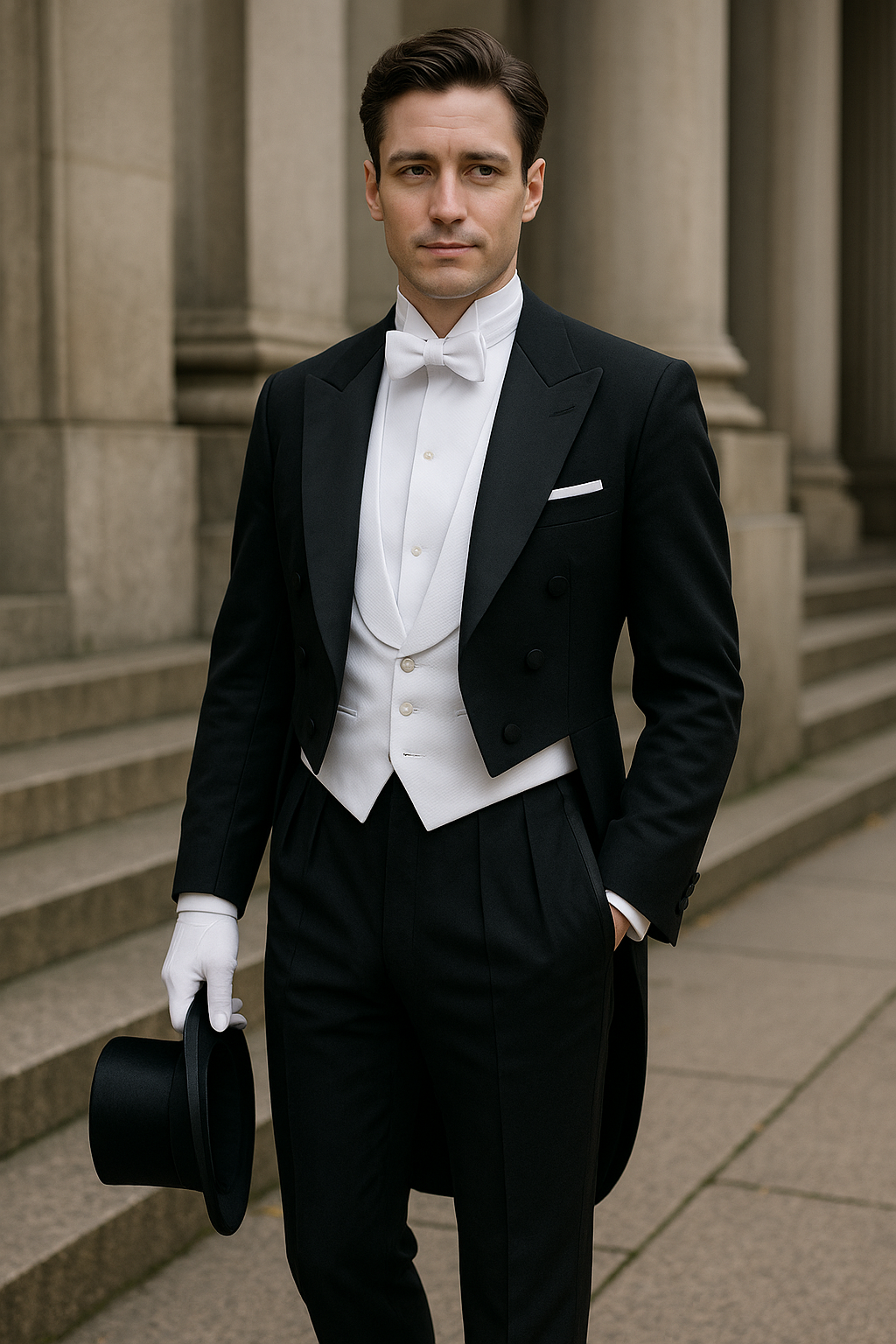 Your white tie ensemble must include a black tailcoat with matching high-waisted trousers featuring satin stripes, a white wing-collar shirt, white waistcoat in piqué cotton, and a white bow tie that should be hand-tied. Complete the look with black patent leather shoes, and consider optional accessories like white gloves or a black top hat for extremely formal venues.