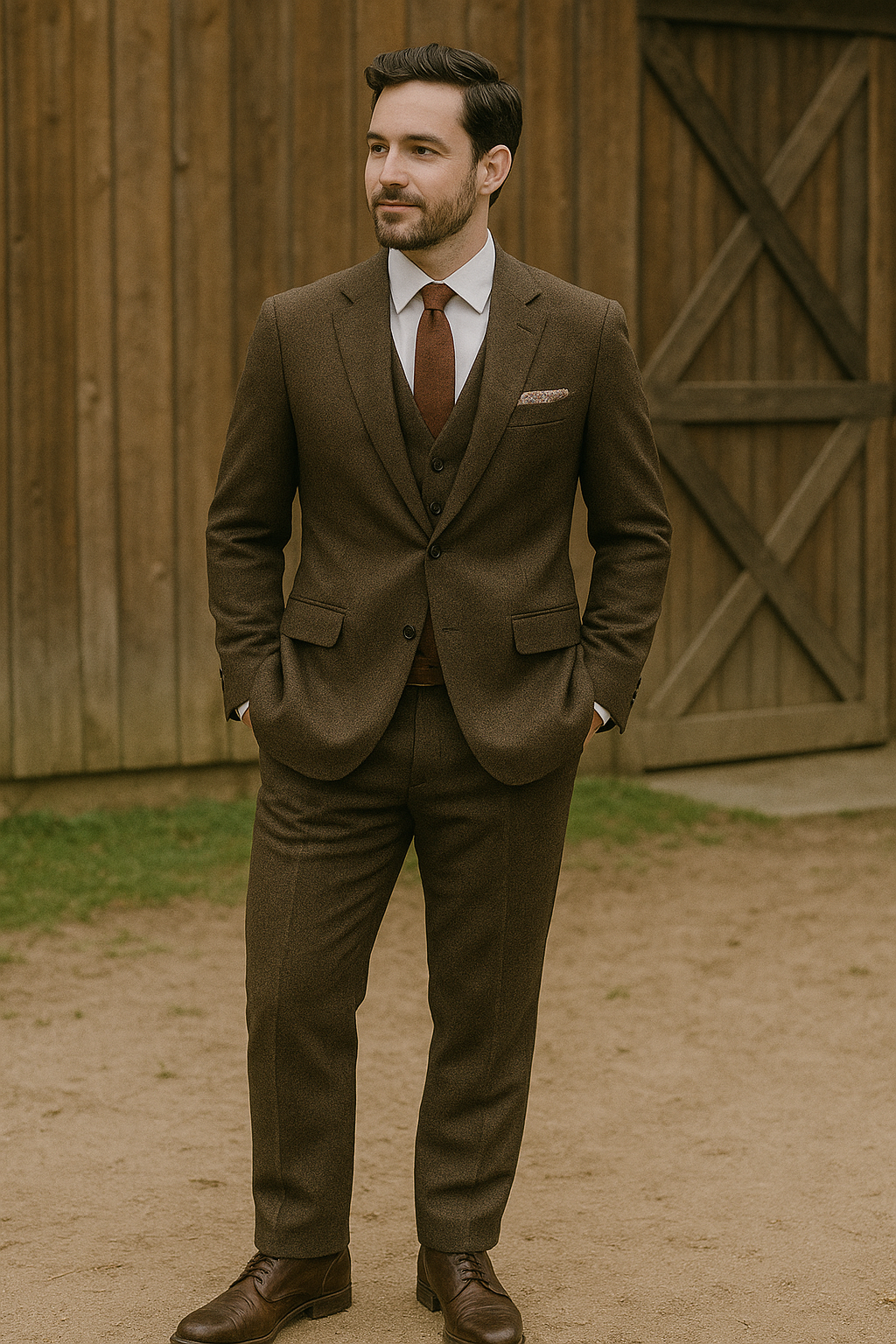 A classic suit in mid-to-light gray, blue, or subtle patterns works well, or choose a tailored blazer with well-fitted dress trousers. Shirts may feature lighter colors or subtle patterns, and ties are generally expected but may be omitted for afternoon or summer weddings depending on the venue.